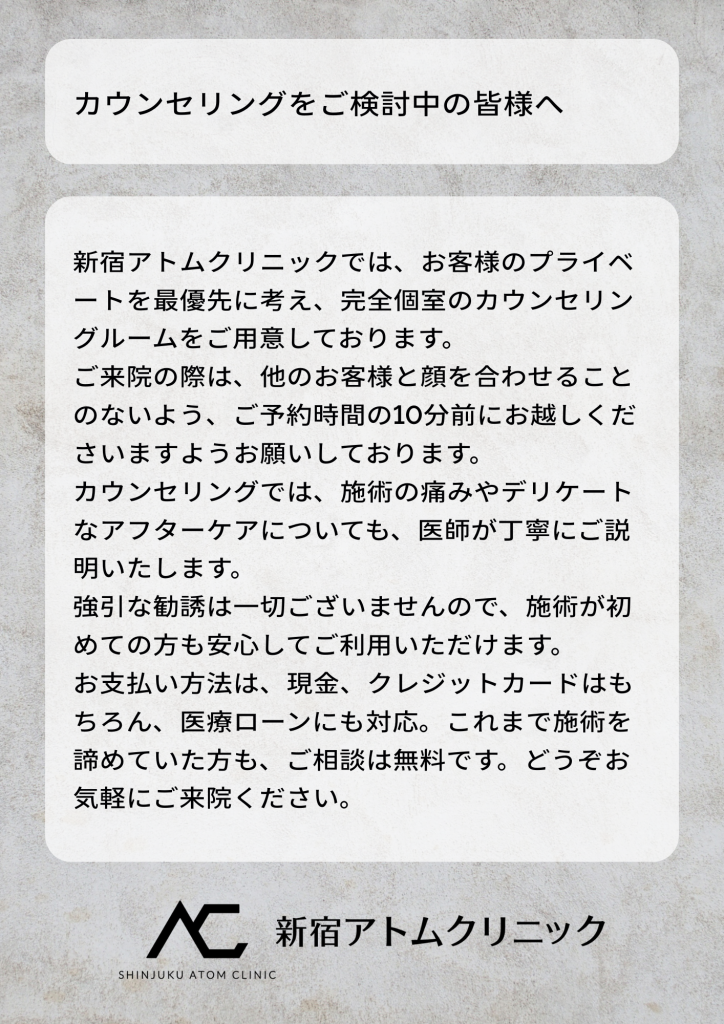 | 切らない長茎術 Narumi式切開長茎術 | ¥330,000〜¥770,000 ローン時 月額¥3,300〜 医療ローン71回ご利用の場合 初月¥4,290 2回目以降月額¥3,300 |